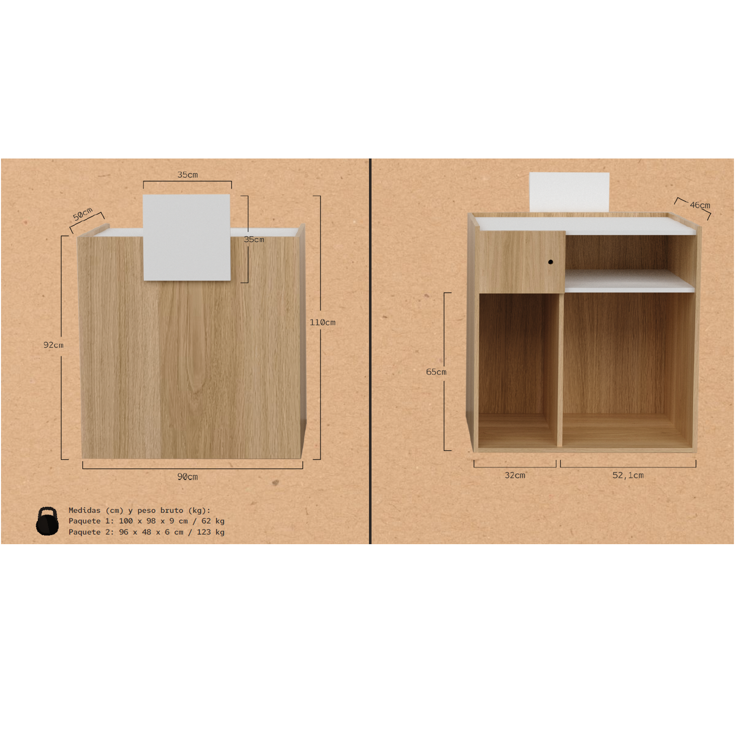 O painel superior e a frente elevada em branco decorativo acrescentam leveza e contraste ao design, enquanto o interior foi projetado para otimizar o espaço de arrumação, permitindo organização eficiente e fácil acesso aos materiais.
