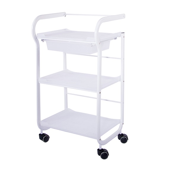 Carrinho Ajudante Easy branco com estrutura metálica equipado com gaveta e 3 prateleiras para encaixar dispositivos de mesa ou para guardar vários acessórios de beleza.