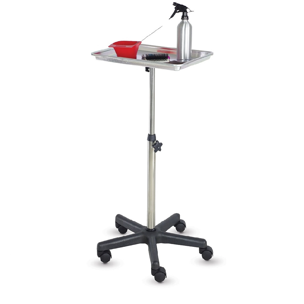 Carrinho auxiliar Jeff com bandeja de alumínio, base de nylon e poste ajustável em aço inoxidável.