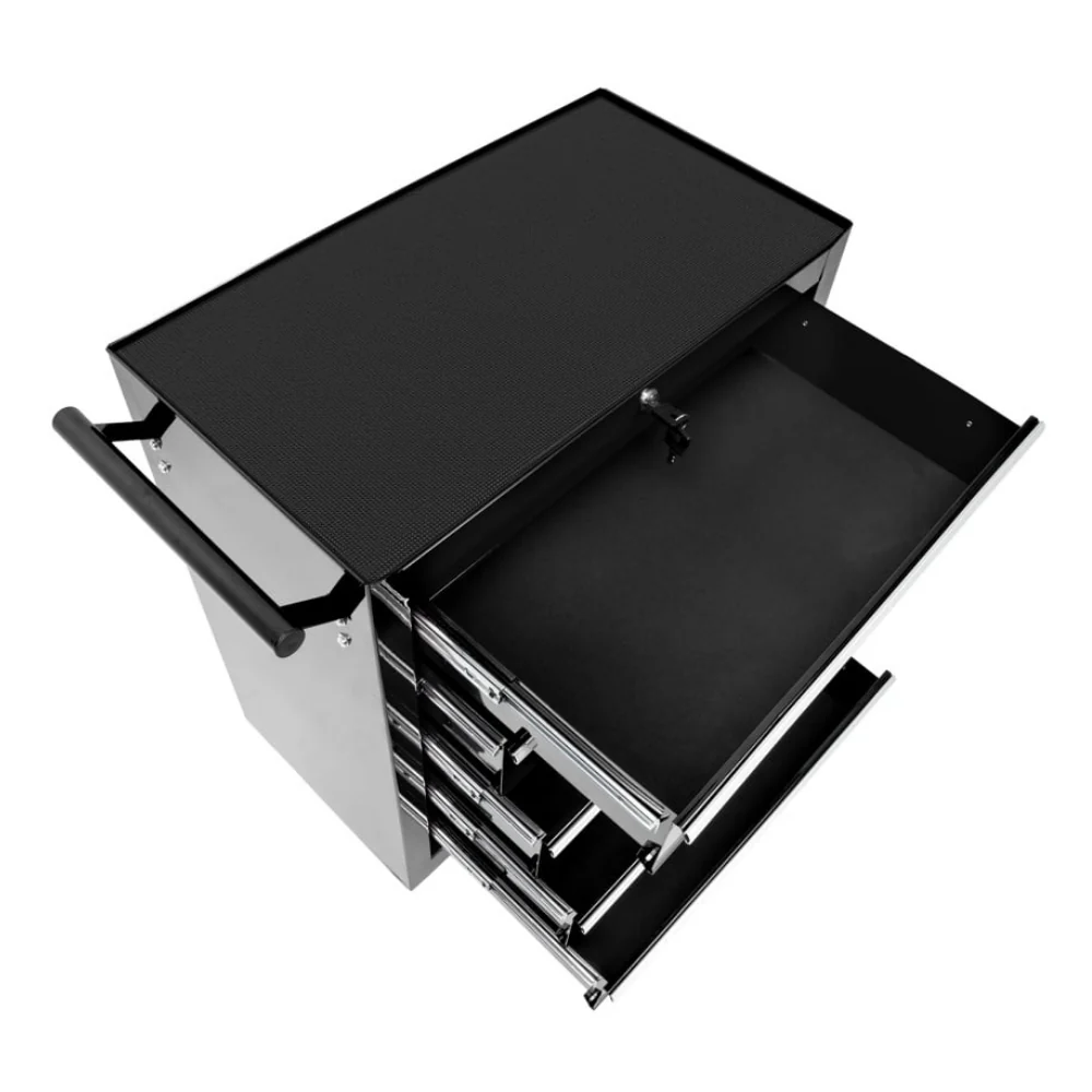 Pensado para garantir máxima segurança, está equipado com sistema de fecho com chave e duas barras de proteção, assegurando que todo o material fica devidamente protegido. Os tapetes antiderrapantes presentes nas gavetas e no topo evitam deslizamentos, mantendo tudo no lugar.